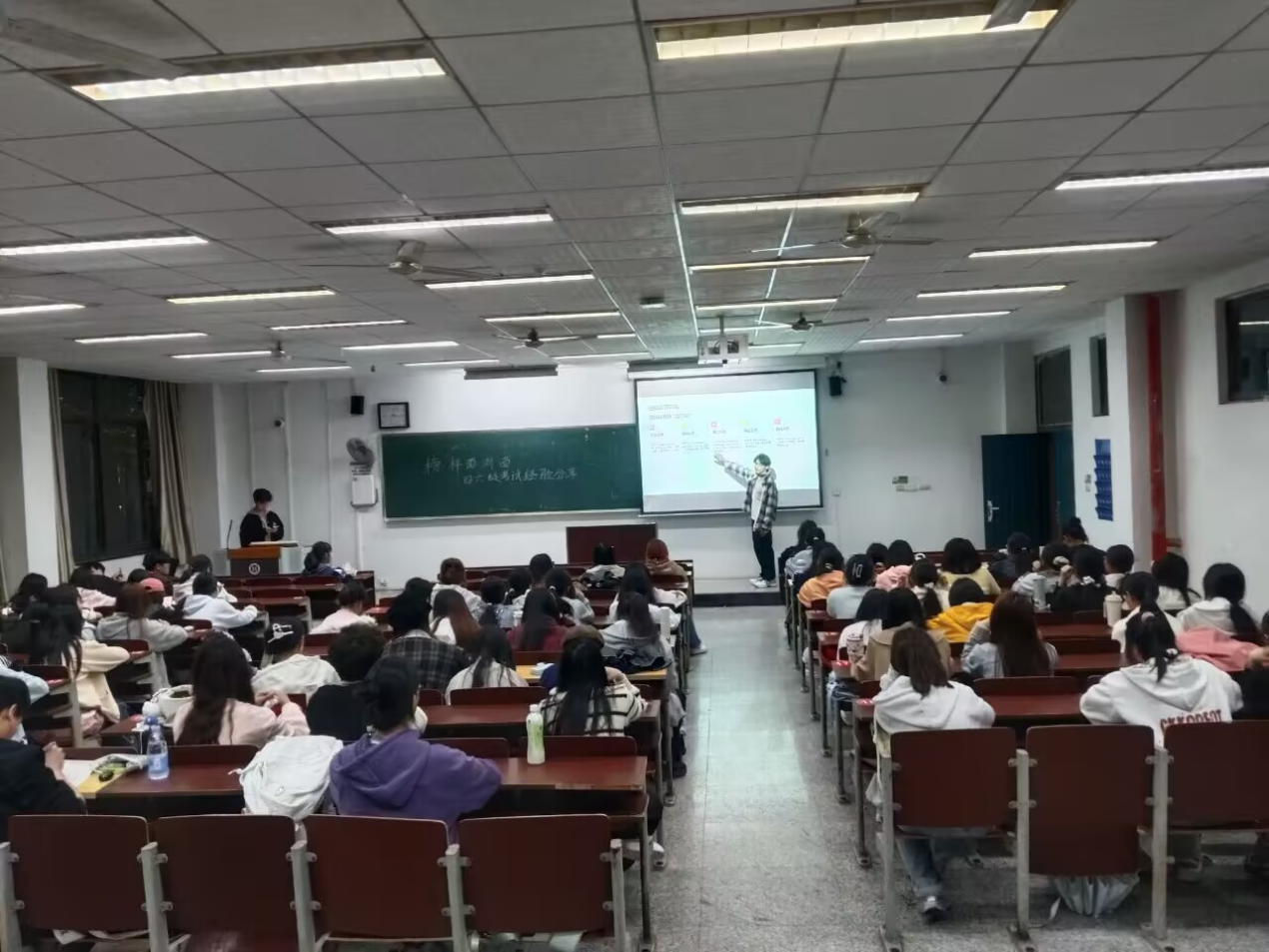 本网消息 4月14日,师范学院在J3-102举办“四六级高分突破攻略”经验分享交流会。交流会特邀贾元元、刘岩两位四六级高分学子主讲,全院各年级有备考需求的100余学生踊跃参与,现场学习氛围浓厚。