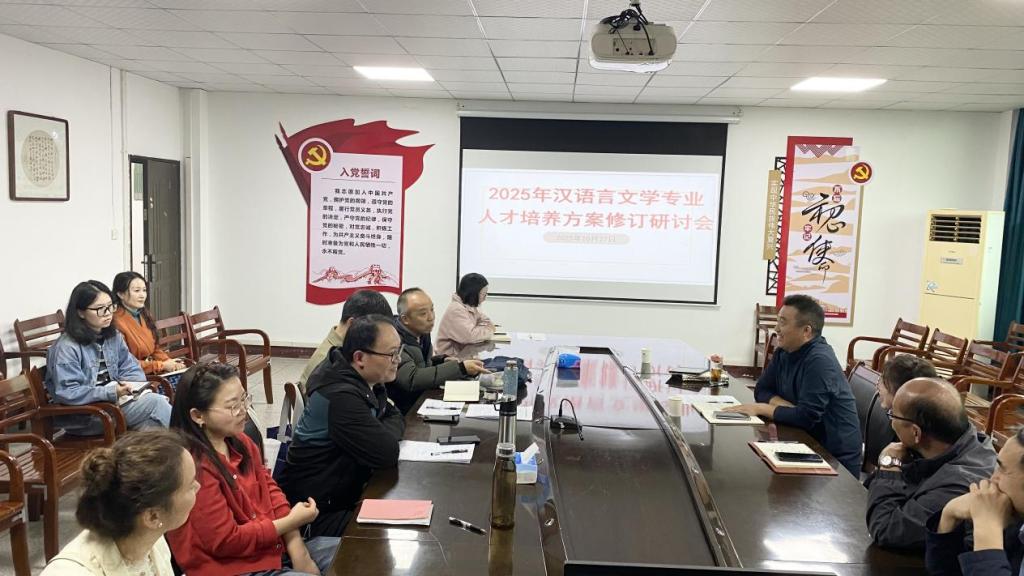 本网消息 10月27日下午,师范学院召开2025年汉语言文学专业人才培养方案修订研讨会,围绕2024版人才培养方案存在的问题展开讨论。教务处副处长赵旭德和余文老师出席会议,师范学院院长胡邦岳、副院长刘燕、文学教研室主任朱克理、语言学教研室主任刘会龙、网媒教研室主任孙茜及汉语言文学专业教师二十余人参加了会议。会议由刘燕副院长主持。