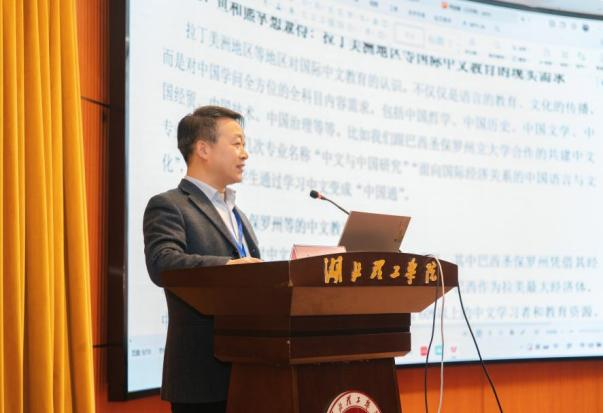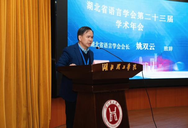 湖北省语言学会会长姚双云教授对湖北理工学院的大力支持表示诚挚的感谢。他指出,在新文科建设深入推进的背景下,语言研究需要实现四个转向:从“书斋之学”转向“时代之问”,从“单一学科”转向“交叉融合”,从“理论研究”转向“实践赋能”,从“传统教育”走向“AI产业前沿”。并呼吁全省青年语言学人守正创新、追求卓越,早日成长为推动湖北语言学事业发展的中流砥柱。