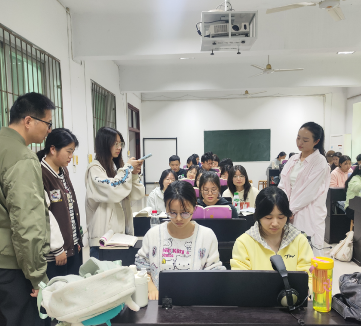本网消息 4月7日,清明节后第一节课,为全面压实教学责任、保障节后教学平稳有序,师范学院党总支书记刘显、党总支副书记曹中兵、副院长刘燕带领教学办、学工办相关老师组成教学检查小组,深入课堂实地检查教学运行、师生到岗、课堂秩序及教学保障等工作。