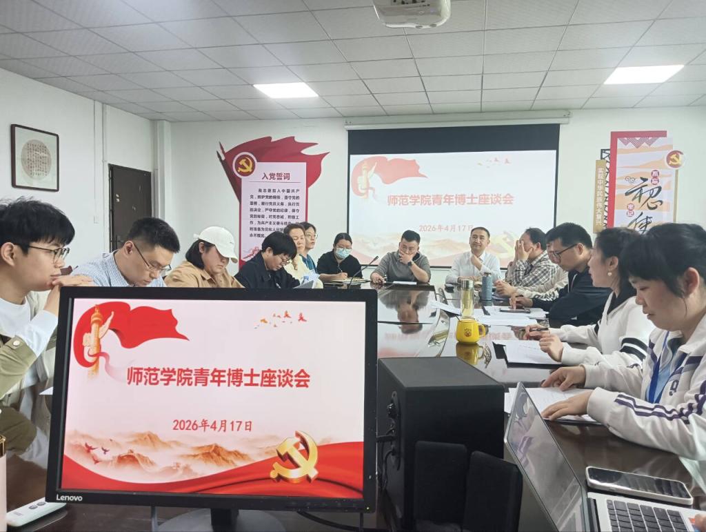 本网消息 2026年4月17日下午,师范学院在407会议室隆重召开青年博士座谈会,以"赋能青年博士成长 汇聚智慧共启新篇"为主题,共商学院高质量发展大计。会议由胡邦岳院长主持,学院领导班子成员、相关科室负责人及青年博士代表齐聚一堂,共话发展。